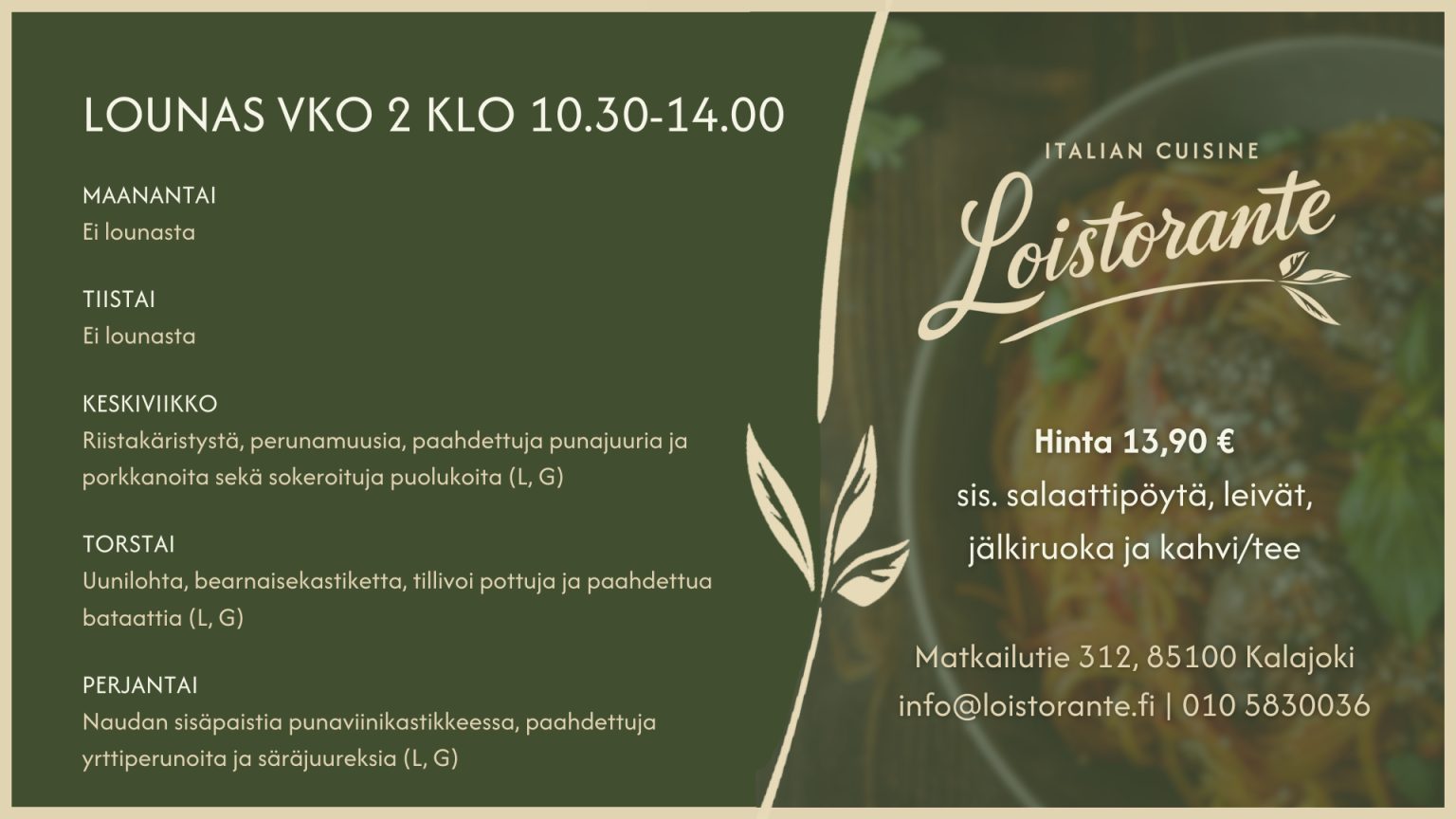 Keittiömme sulkeutuu puoli tuntia ennen ravintolan sulkeutumista.